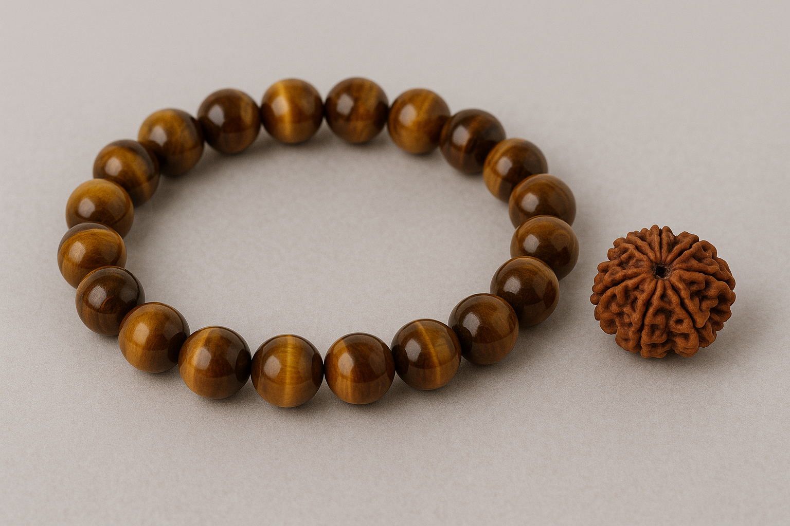 Wear the Tiger Eye bracelet and 11 Mukhi Rudraksha together for a stylish yet spiritual look that complements both traditional and modern outfits.